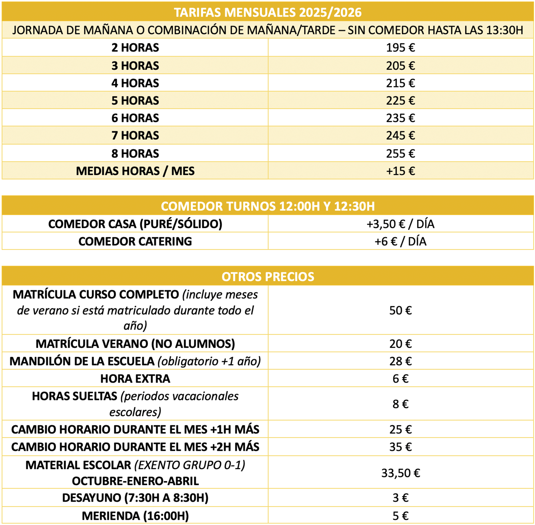También se incluye en el precio de la mensualidad el desayuno para aquel alumnado que esté fijo en el horario de madrugadores (7:30h a 8:30h) y la merienda a aquellos niños/as cuyo horario habitual sea hasta pasadas las 16:30h. Todos los días la Escuela ofrece fruta variada como tentempié (10:30h) sin coste extra.